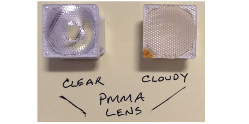 UV-A LEDs present an extra challenge for optics. Common LED optics are made from PMMA (acrylic) – it’s cheap, easily molded into the required shape, and transparent for visible light. However, PMMA absorbs UV and will solarize (yellow and cloud over). The same phenomenon can be seen in older automotive headlights - with exposure to the UV from the sun the clear plastic becomes cloudy.