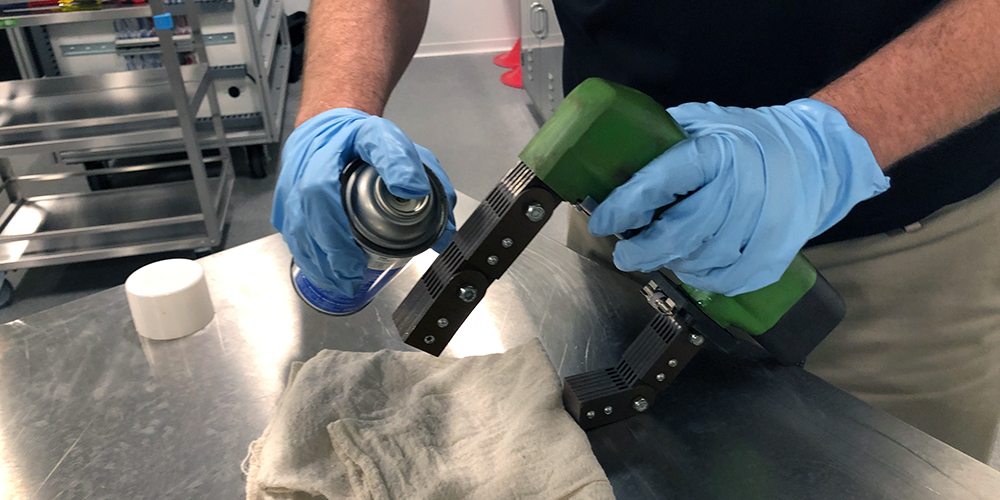 Check the power cord and switch to make sure they're in good condition. Check that the legs can bend to conform to the inspection surface. Check the feet to make sure they can make even contact with the inspection surface. The more contact area, the better.